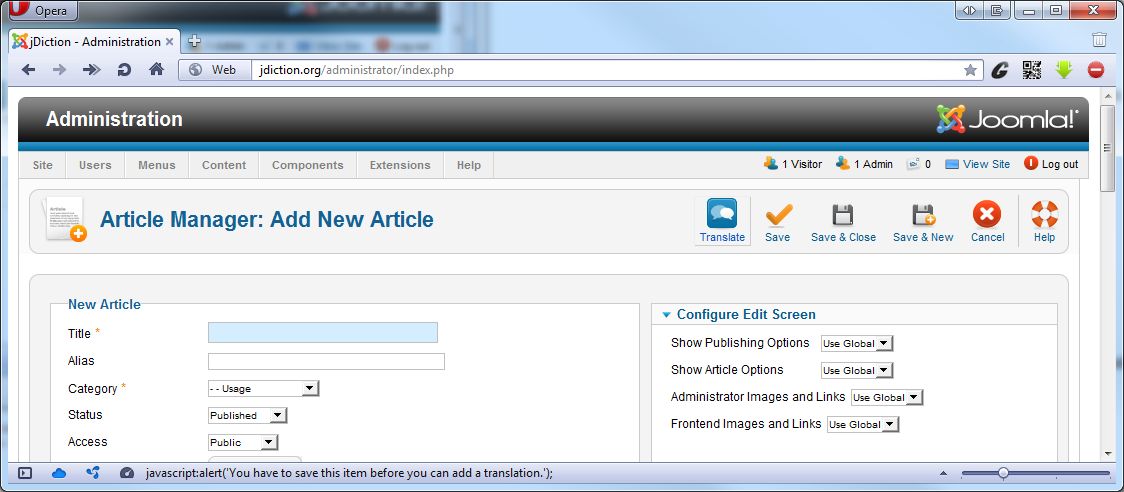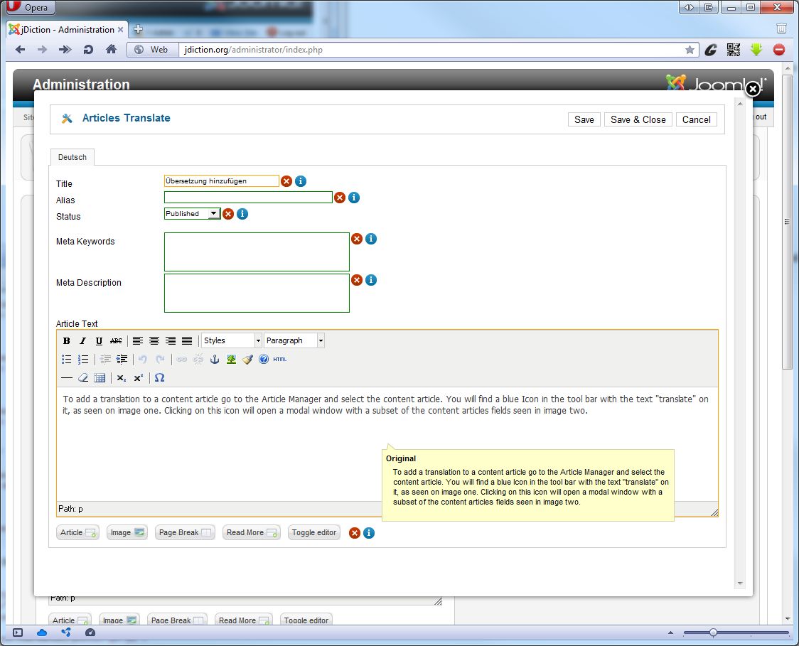 To add a translation to a content article go to the Article Manager and select the content article. You will find a blue Icon in the tool bar with the text "translate" on it, as seen on image one. Clicking on this icon will open a modal window with a subset of the content articles fields seen in image two. In this Joomla version (2.5.4) Modal windows in Opera has no black background. You see a tab with "Deutsch" (German) in it, if you have more then one language you will have multiple tabs, one per language. You also see that the input field has a orange border. this indicates that the content of this translation have been changed. In the "Article Text" you see the copied text from the original article, this can be done by clicking the blue "i". If you like to remove a translation click the red "X", this will remove the translation and you will get the untranslated text in the front end. After adding your translation click on save and you should see the result on your website.